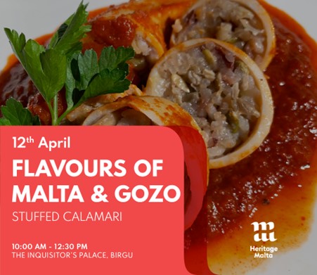 On Saturday 12th April between 10.00am and 12.30pm at the Inquisitor’s Palace in Birgu you can learn how to prepare the succulent local speciality of Stuffed Calamari.