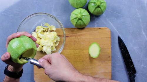 - Cut the tops of the marrows and remove the flesh using a teaspoon or a fruit ball spoon
