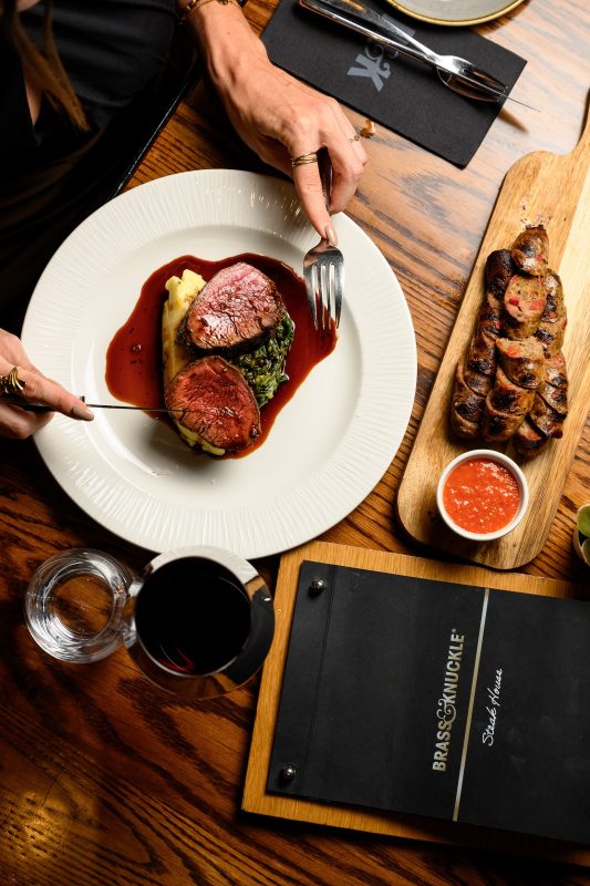 Inside, cuts of Japanese Wagyu, prime USDA, Danish Sagyu beef, lamb rack beg to be taken home or cooked to perfection to dine in. But first, start with a selection of cold cuts and cheeses from the display, accompanied by fresh bread, galletti, bigilla and olive oil, or savour duck foie gras, jamon Iberico, short rib tacos. While Brass & Knuckle offers an enticing choice of mains, the true stars of the show are the cuts of meat. The aged USDA rib eye, Angus fillet, lamb shank is prepared in a special aging cabinet and made to lose 25% of its weight, making it more tender and tasty. With a side of Brass & Knuckle’s signature truffle fries, this marbley and succulent delight becomes carnivore heaven. Conclude with the pistachio cheesecake and you’ll be counting the days till your next visit.