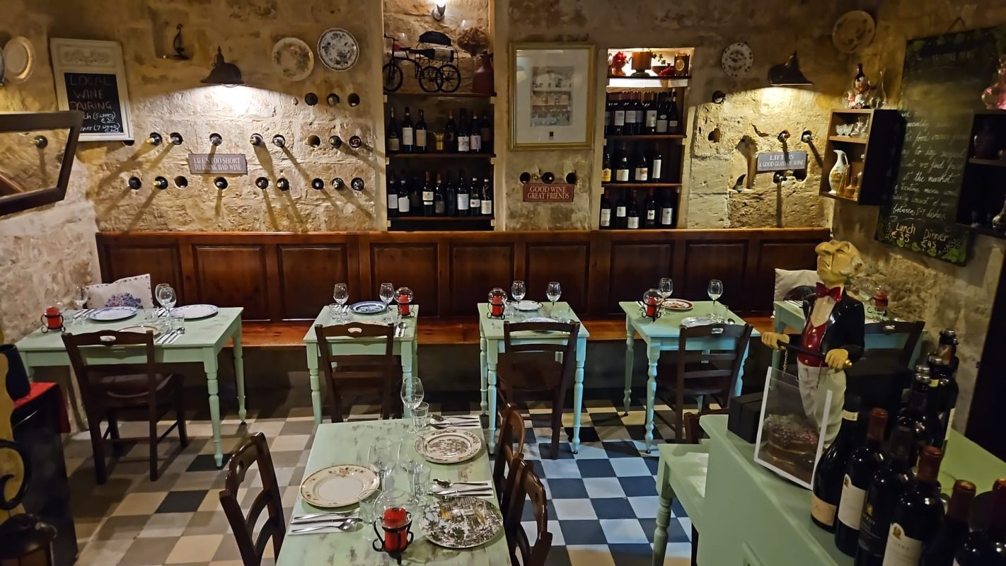 A typical dinner menu consists of seven dishes, each more impressive than the last. A Tapas of local sausage, Ġbejna with a tangy chutney, Tapenade and Gnocchi set the tone with bold, comforting flavours. An Aljotta fish soup and Brungiel, a tender aubergine stuffed with meat, followed beautifully, all served with style and panache. A meaty pasta dish with pork cheeks appears and seconded by a typical rabbit dish, garnished with potatoes steamed in fennel and garlic. A perfect combination packed with warmth and flavour. Desserts are a choice but limited. A divine créme brûlée catches attention, but the Pudina, Malta’s beloved bread pudding, certainly steals the show. A smaller lunch menu of 5 dishes is served daily. Wine paring, whilst recommended, isn’t compulsory, but you would be missing out!