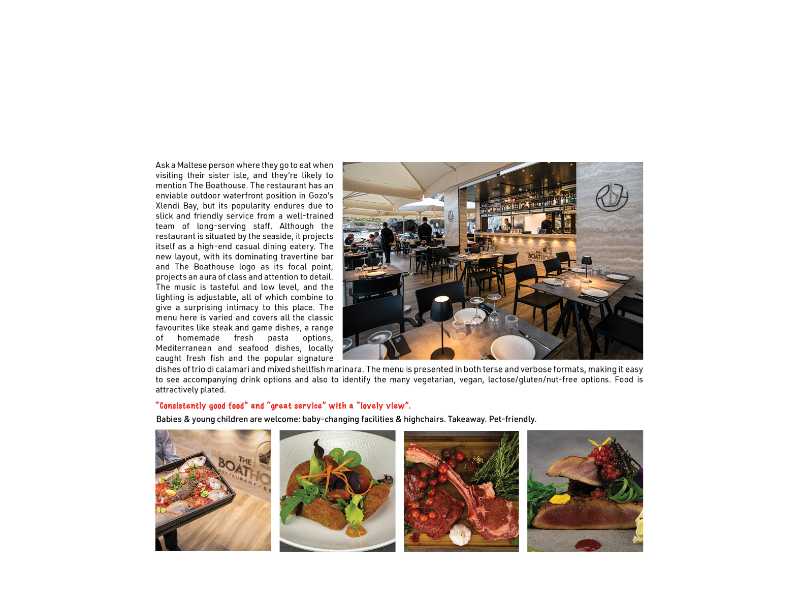 Ask a Maltese person where they go to eat when visiting their sister isle, and they’re likely to mention The Boathouse. The restaurant has an enviable outdoor waterfront position in Gozo’s Xlendi Bay, but its popularity endures due to slick and friendly service from a welltrained team of long-serving staff. Although the restaurant is situated by the seaside, it projects itself as a high-end casual dining eatery. The new layout, with its dominating travertine bar and The Boathouse logo as its focal point, projects an aura of class and attention to detail. The music is tasteful and low level, and the lighting is adjustable, all of which combine to give a surprising intimacy to this place.